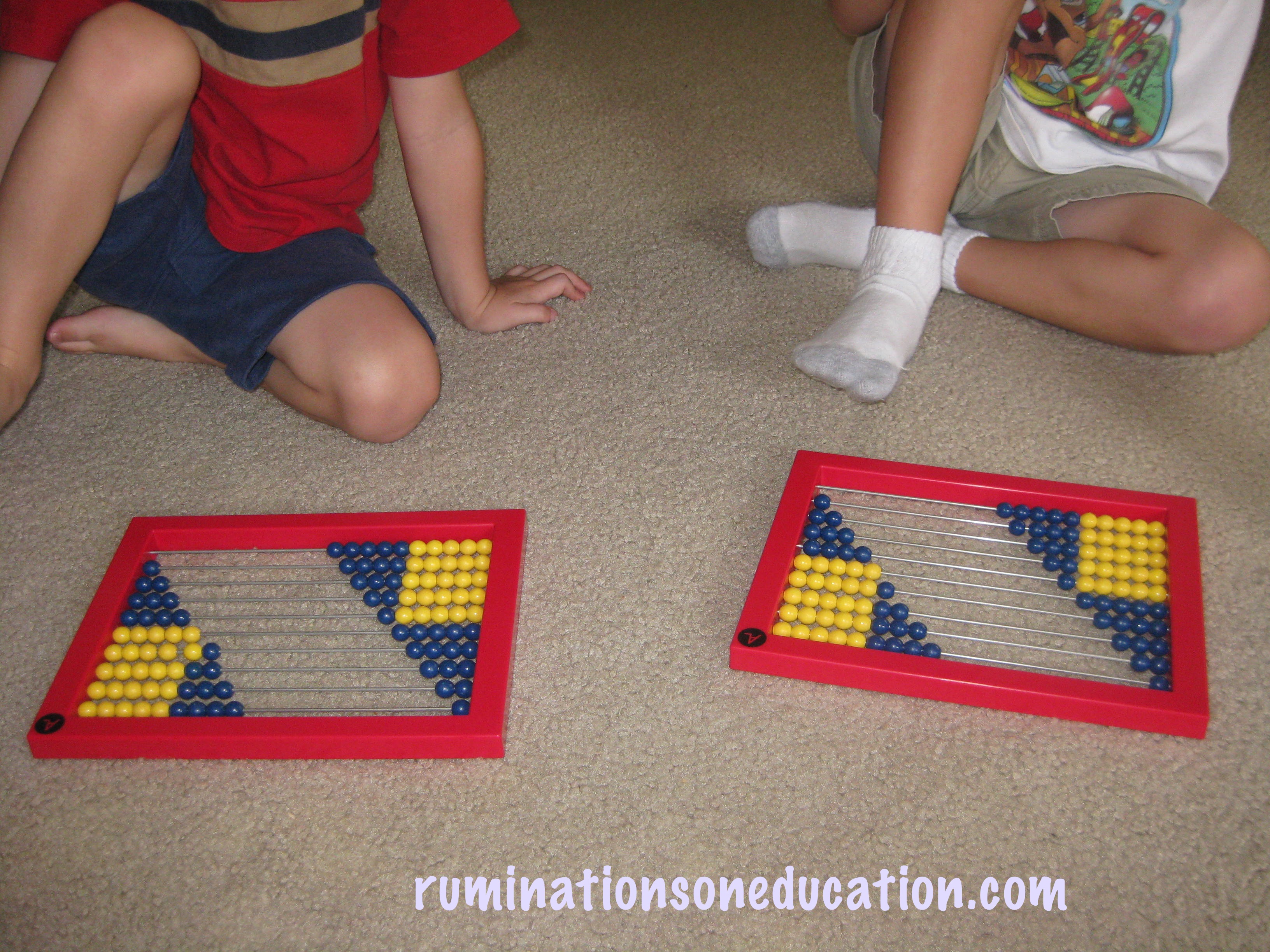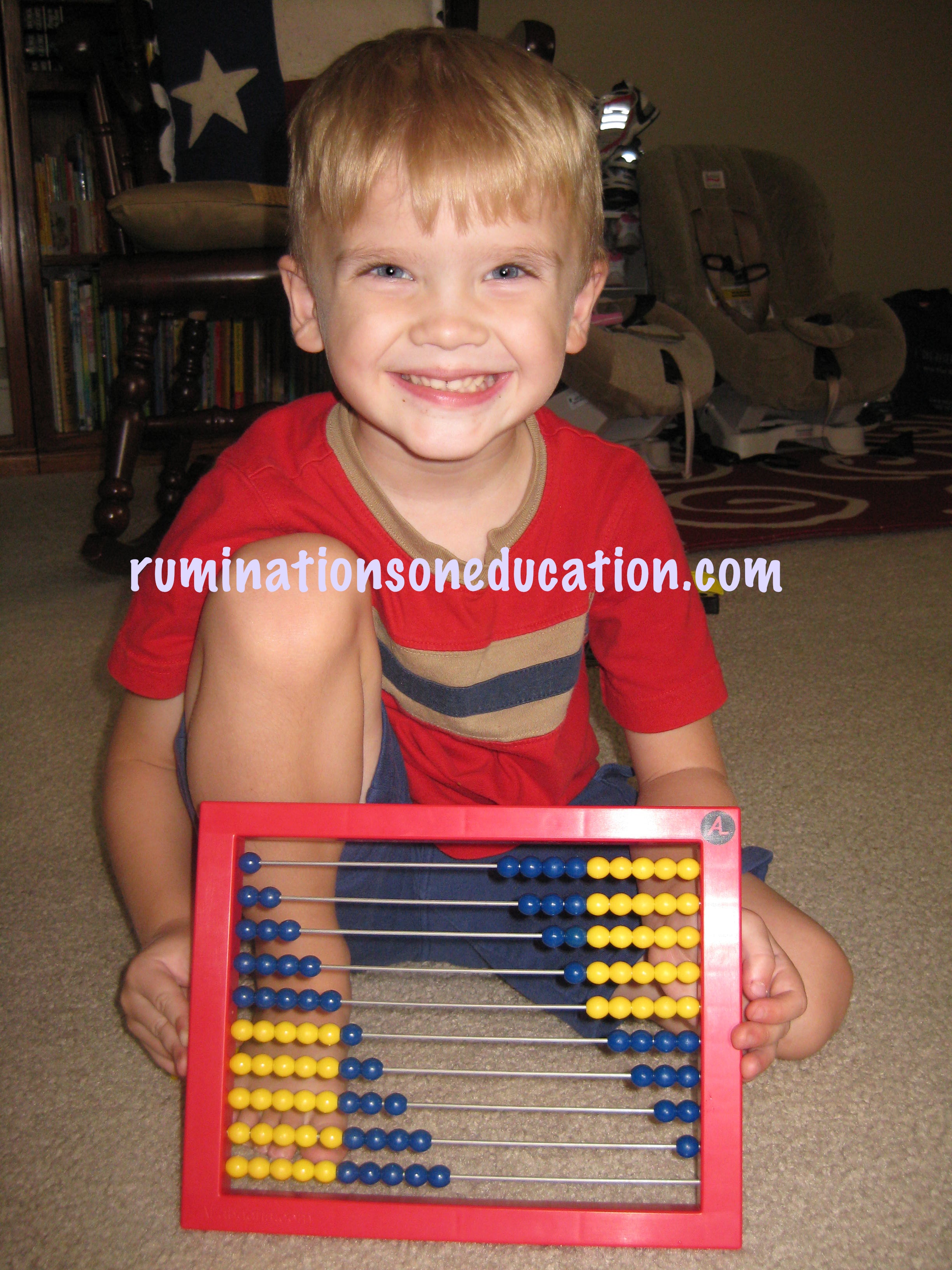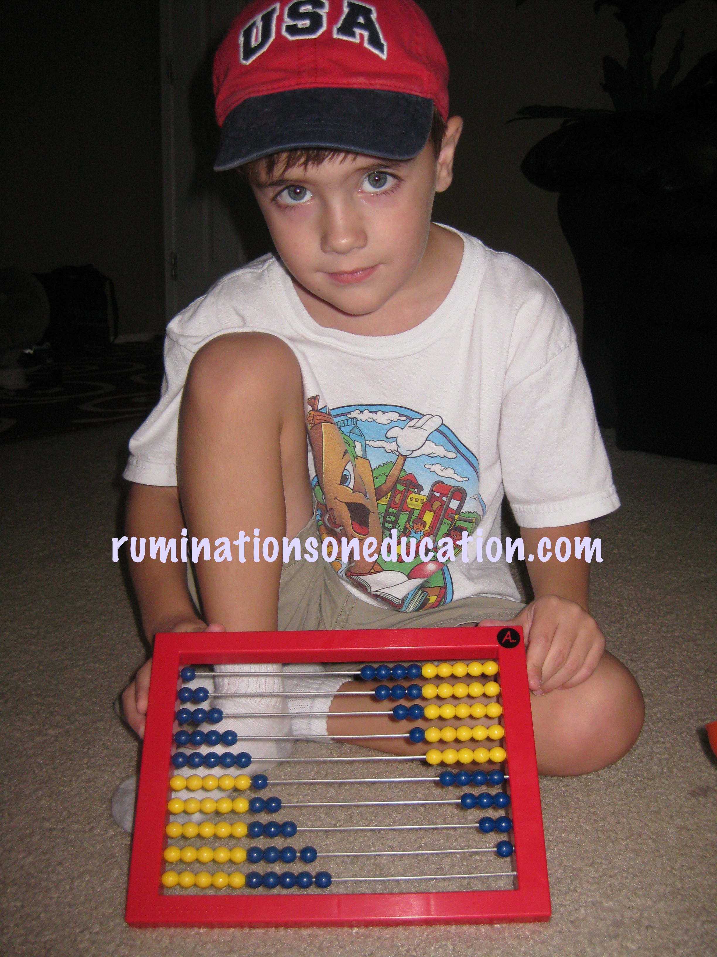A few weeks ago, we got to “Build the Stairs” on our abacuses, meaning the boys entered one bead on the first wire, two on the second, three on the third, and so on. Nothing that required great skill, but it was fun for them to do something different with the abacus besides basic math.