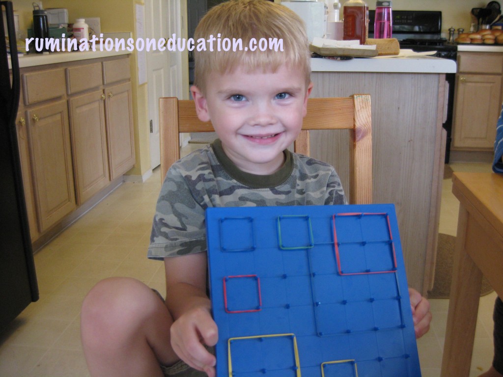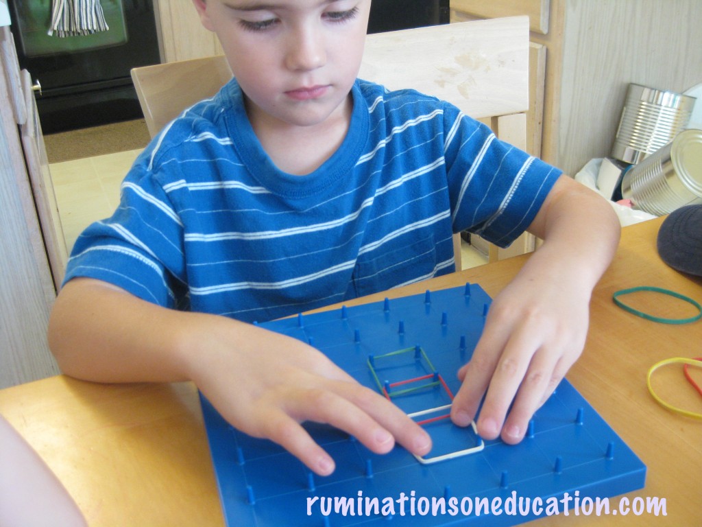 I generally don’t think to pull out the camera for any of our studies other than science and art, but I have taken a few during some math classes as of late. Here we are today, working on our squares/rectangles/quadrilaterals on our geoboards: