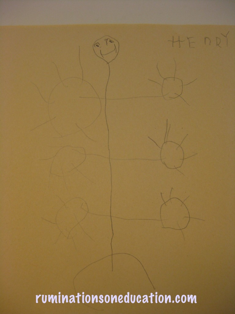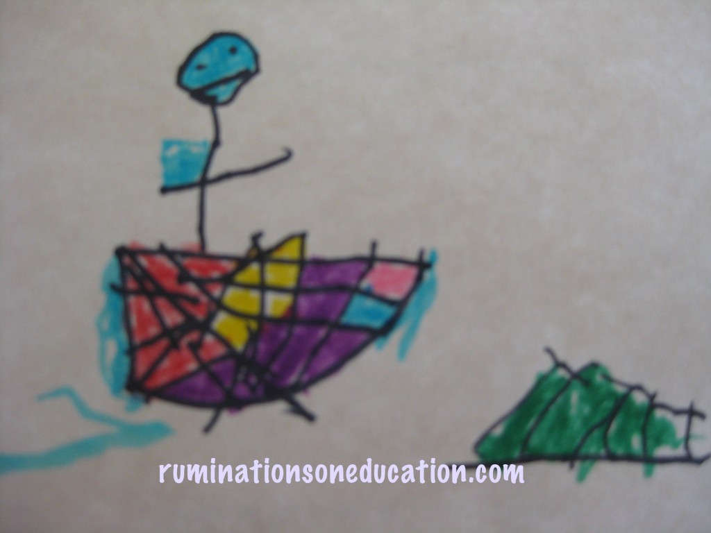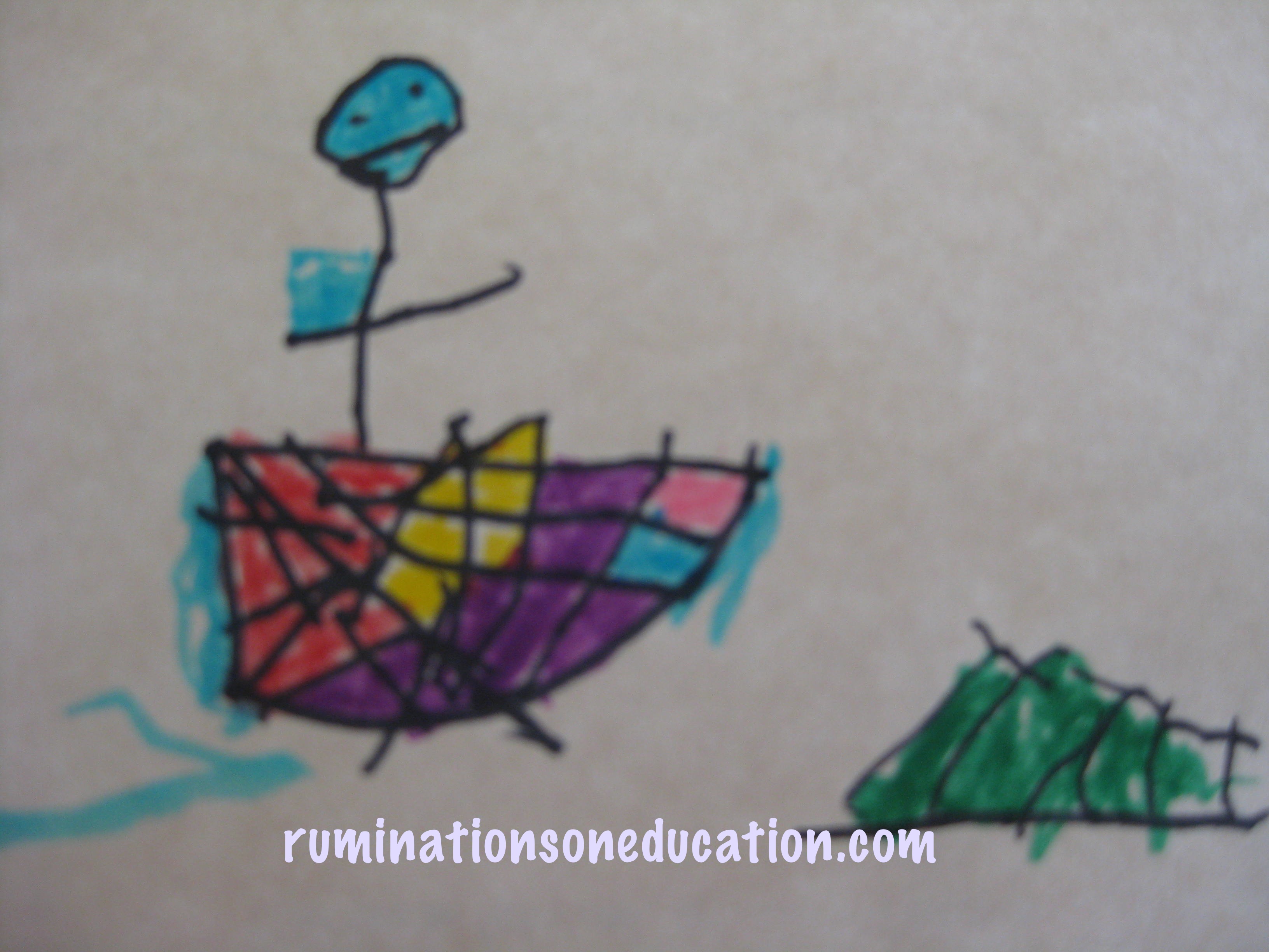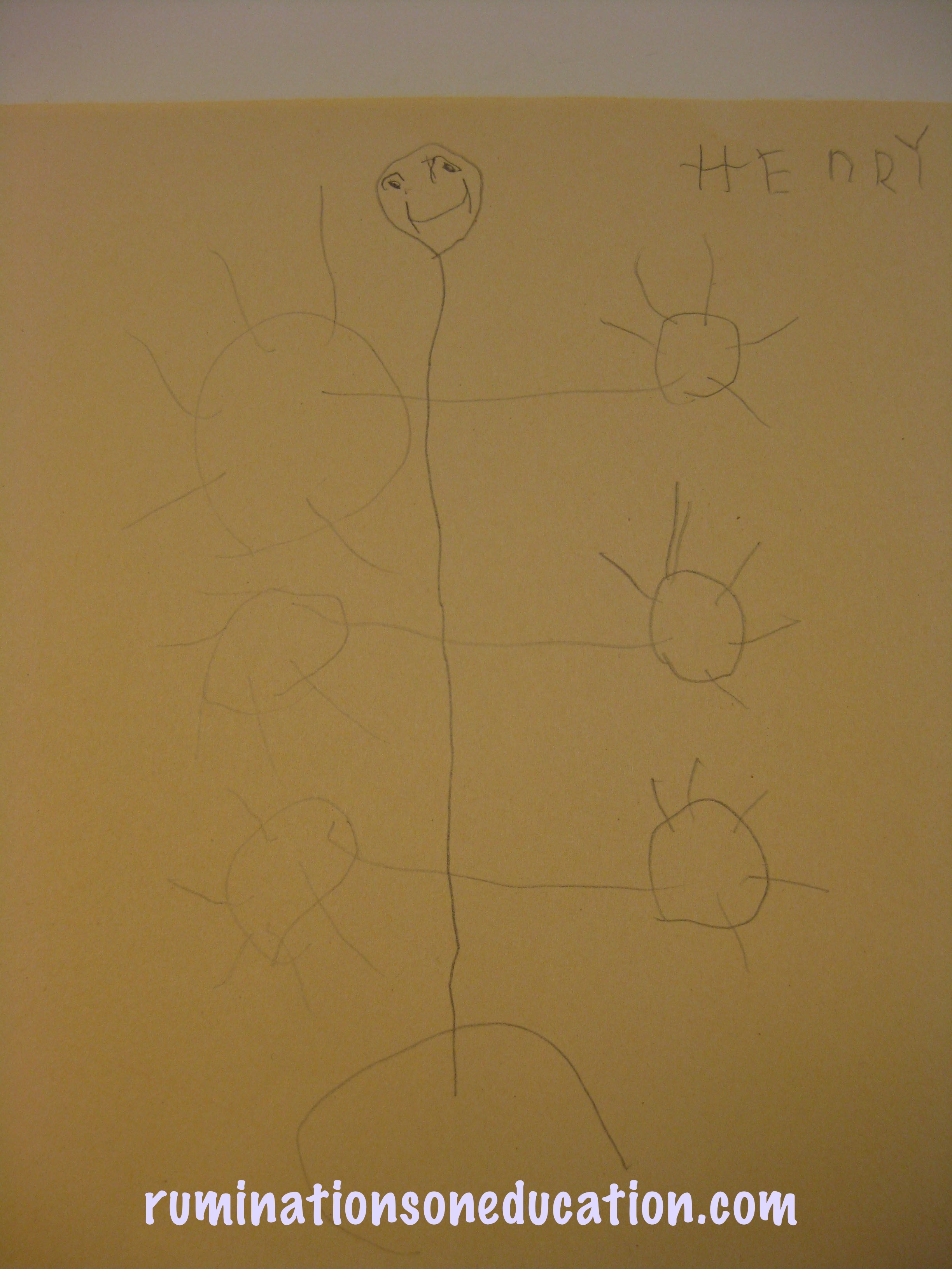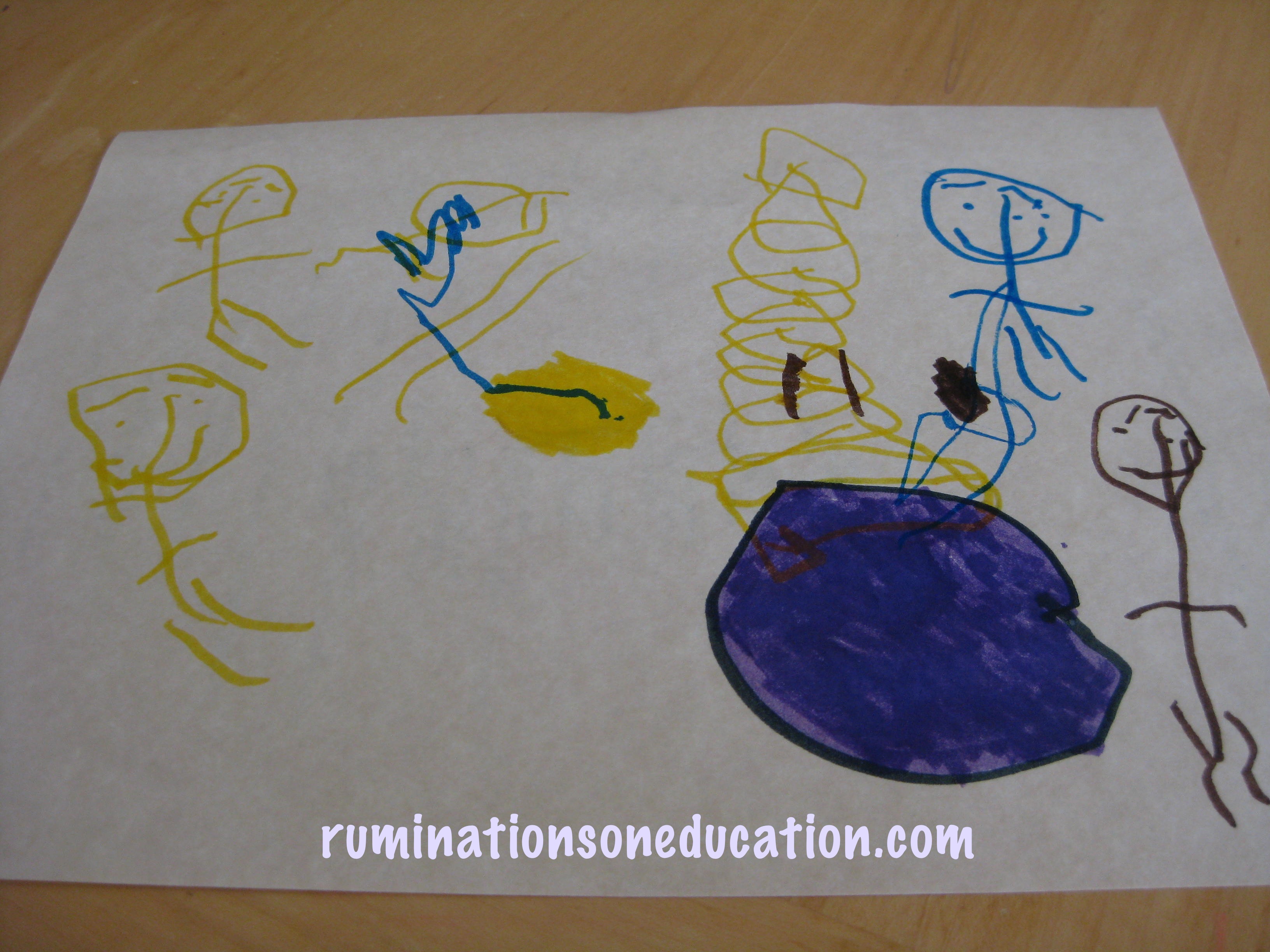 Henry and Sam had a great time creating their own stories. We took our piece of drawing paper and folded two sidebars on the edges. I wish the boys had chosen different mediums to create their pictures because they were really great. Sam drew an alien and some alien wars in the sidebars…with a peach-colored marker. Henry also had an alien theme…in pencil. Here are the pictures I took but they aren’t the easiest to see. Perhaps the best part was listening to them narrate as they drew. Either that, or listening to how the story changes every time I ask them to tell me about it.