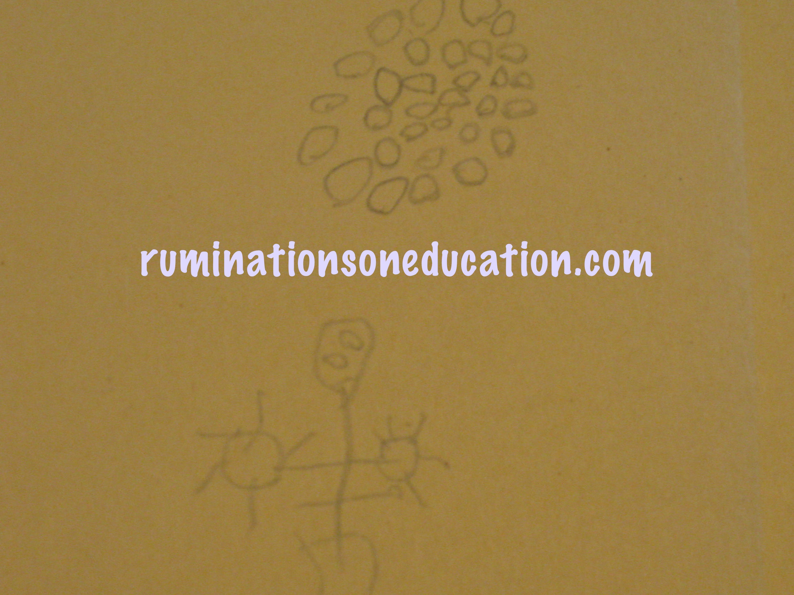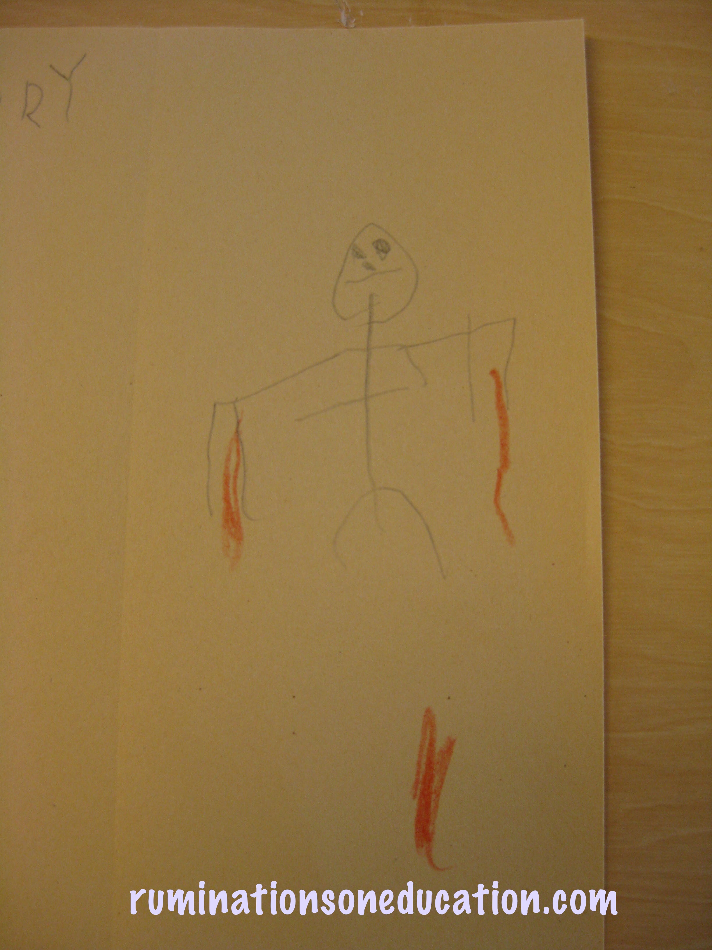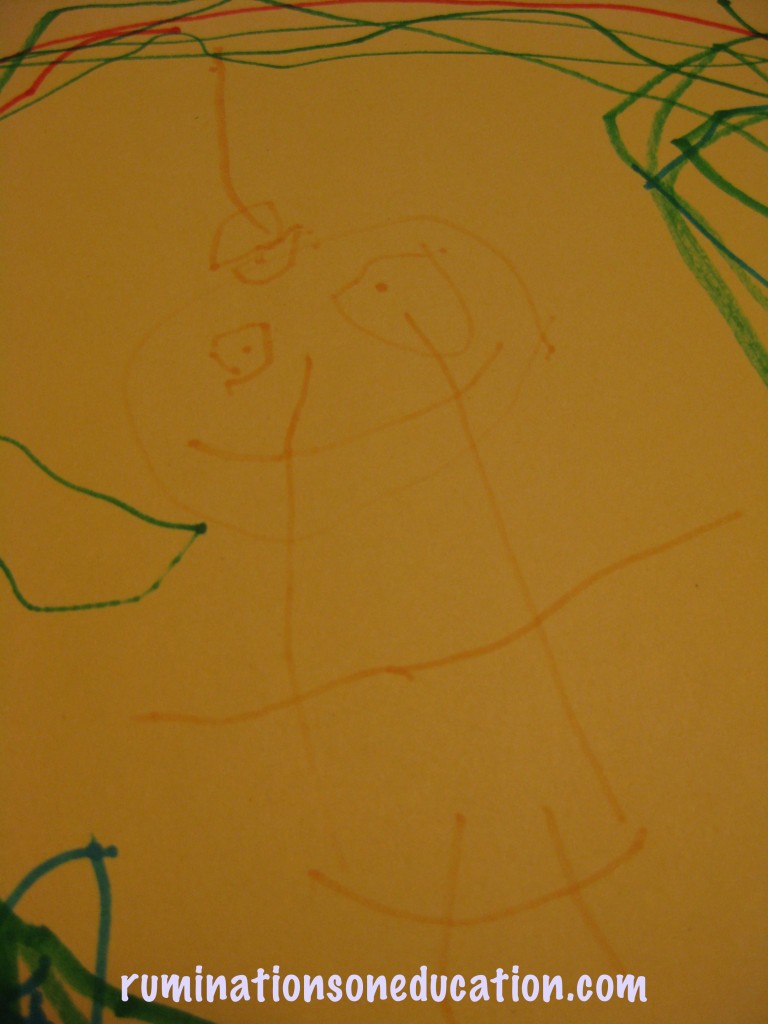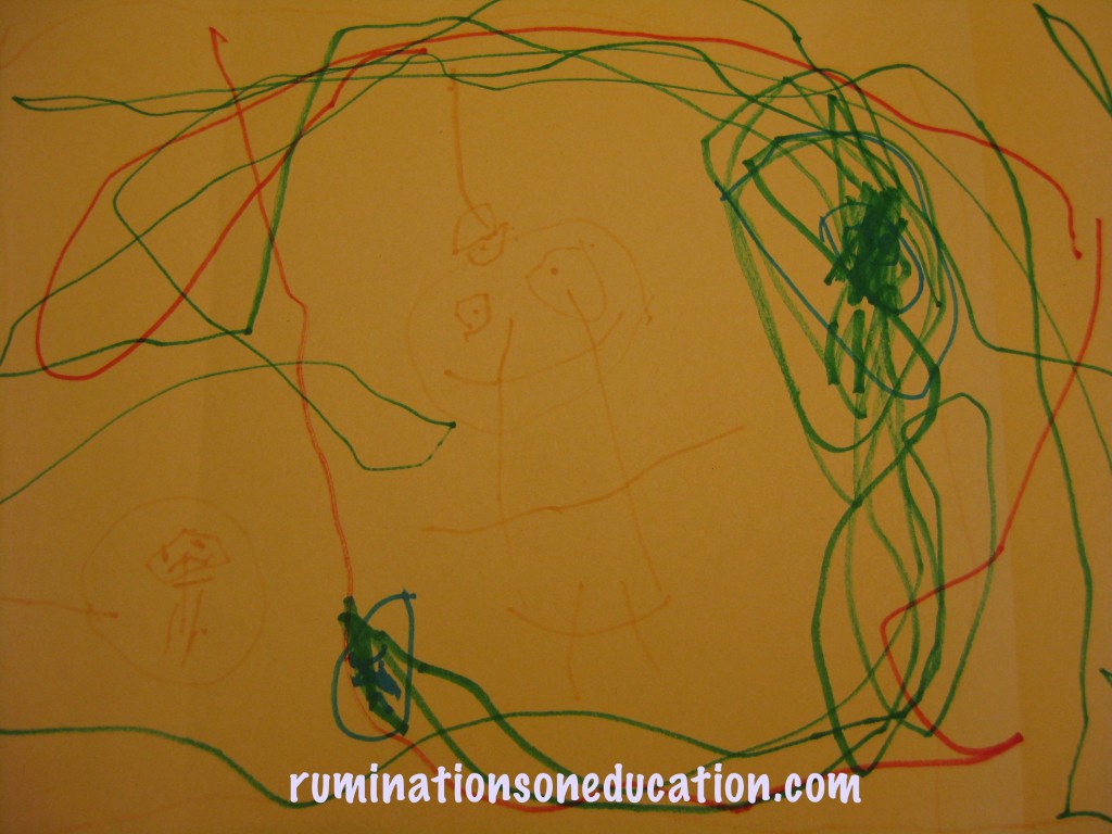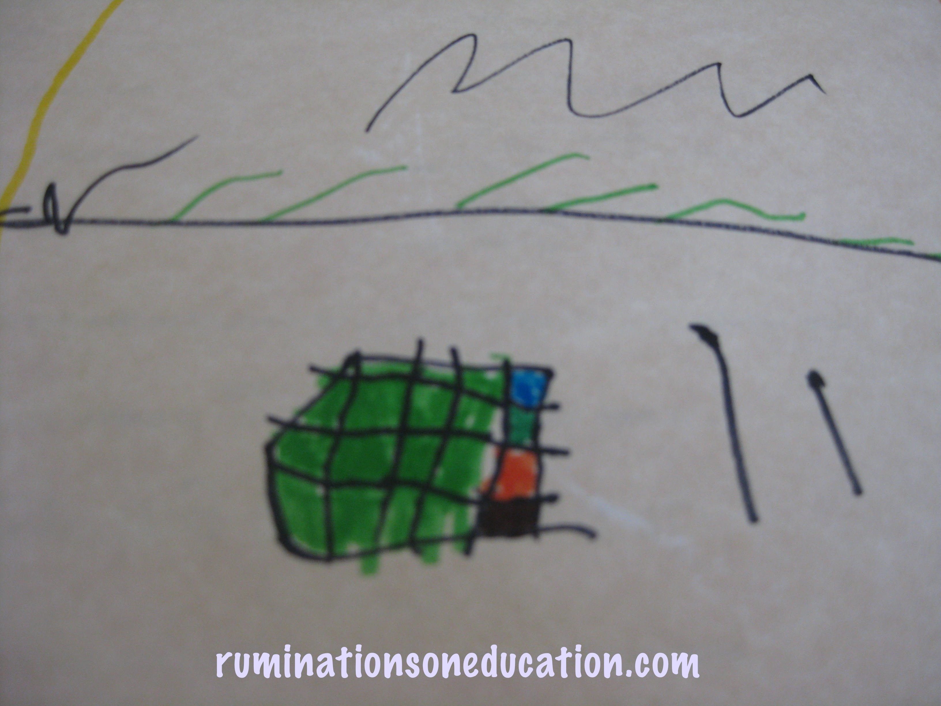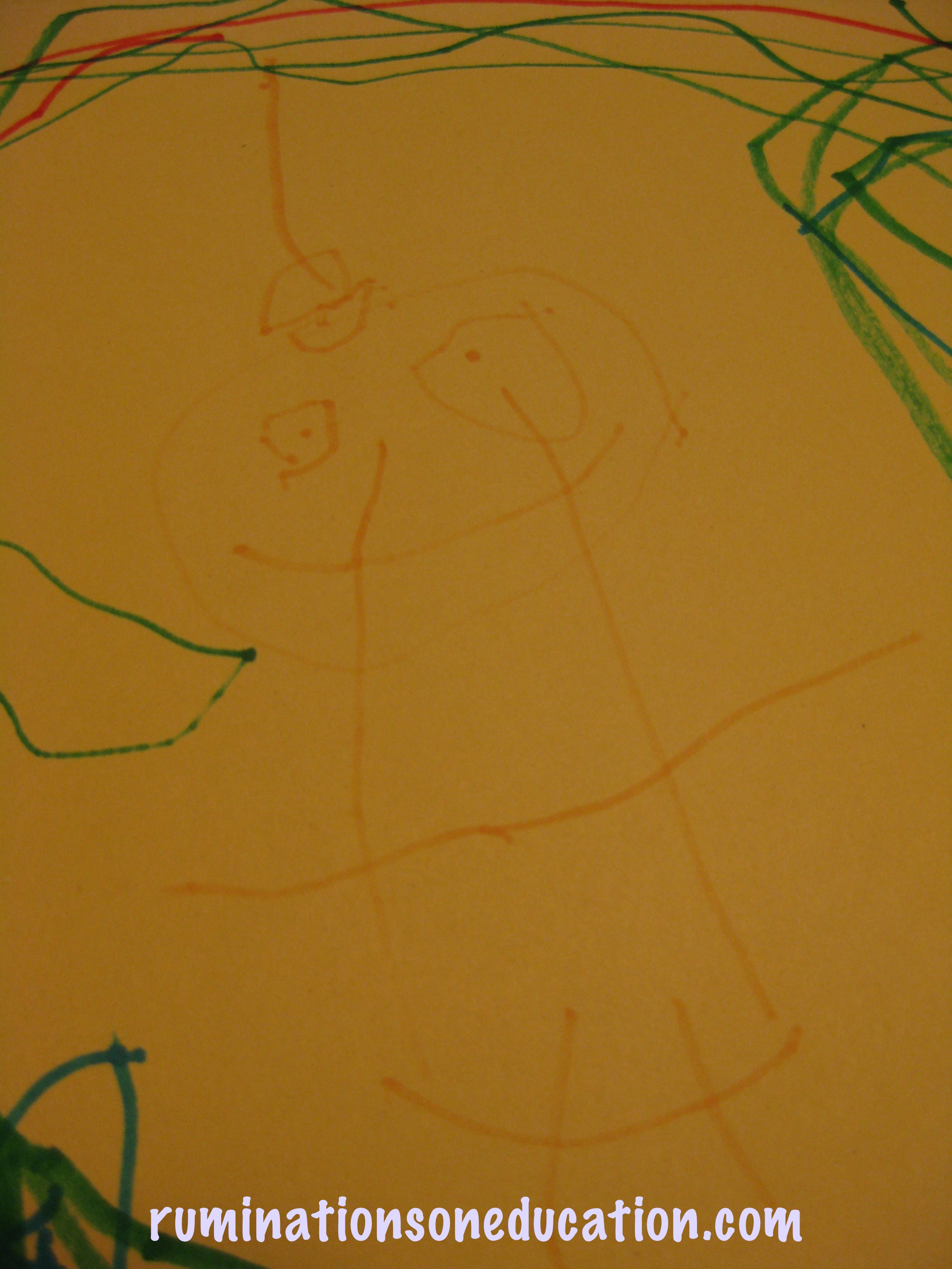 Henry and Sam had a great time creating their own stories. We took our piece of drawing paper and folded two sidebars on the edges. I wish the boys had chosen different mediums to create their pictures because they were really great. Sam drew an alien and some alien wars in the sidebars…with a peach-colored marker. Henry also had an alien theme…in pencil. Here are the pictures I took but they aren’t the easiest to see. Perhaps the best part was listening to them narrate as they drew. Either that, or listening to how the story changes every time I ask them to tell me about it.