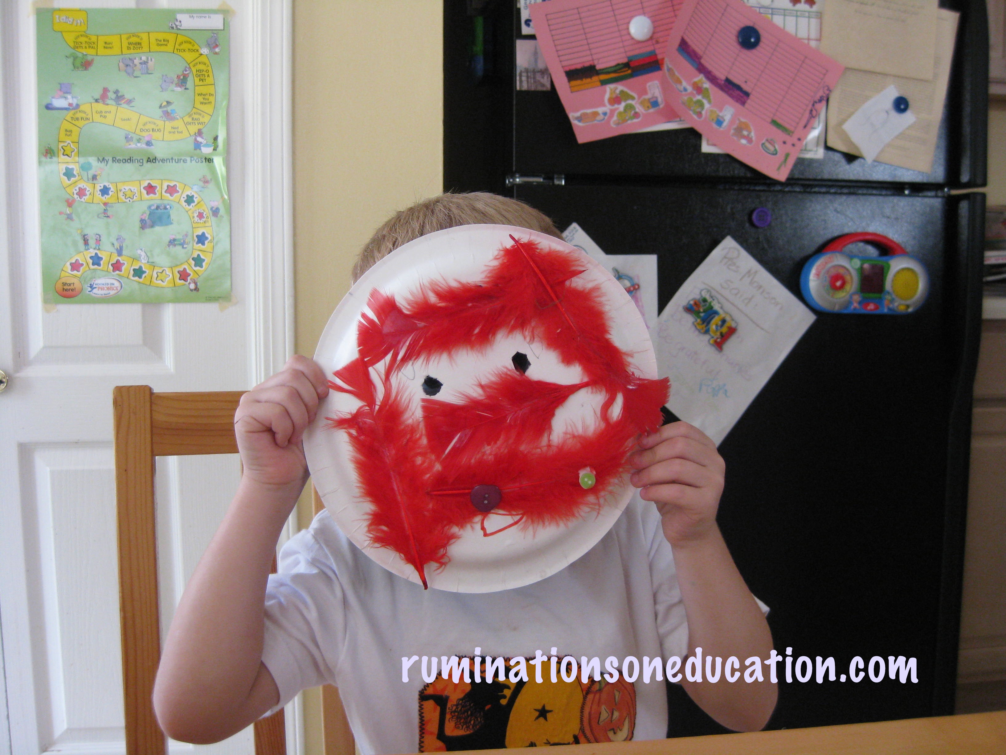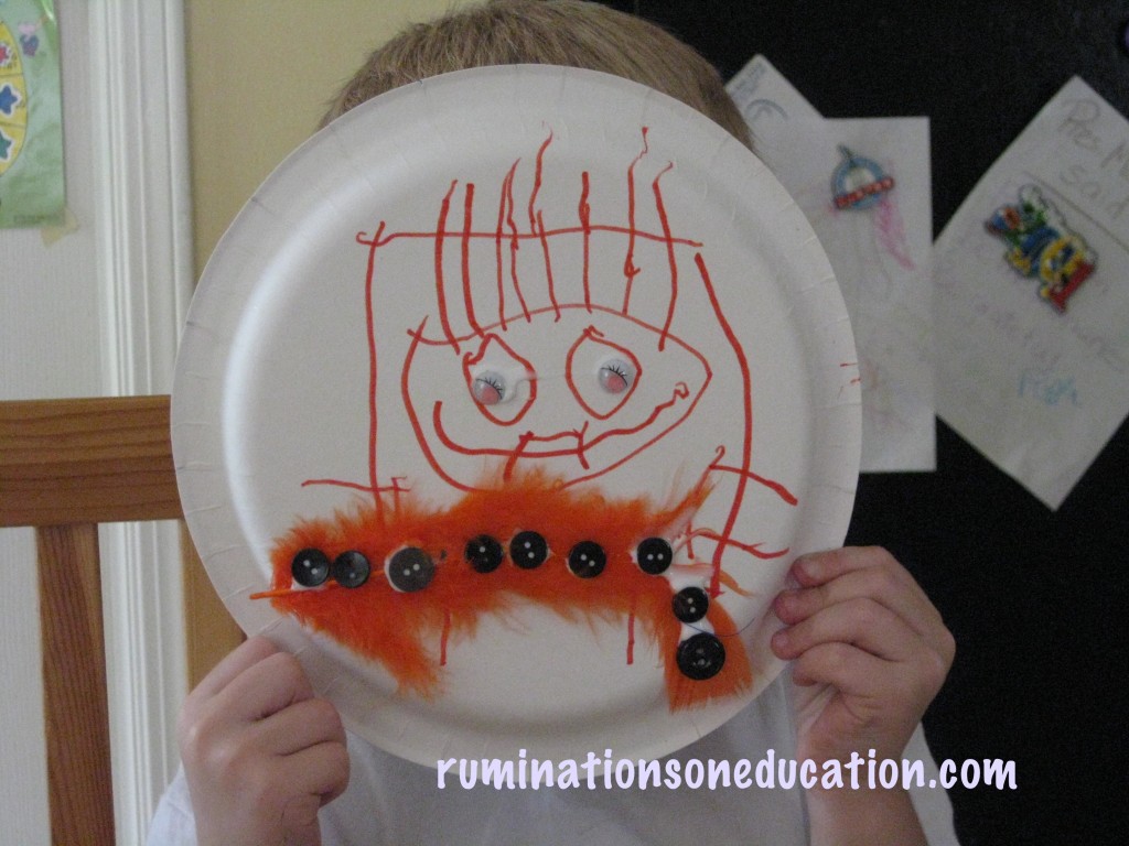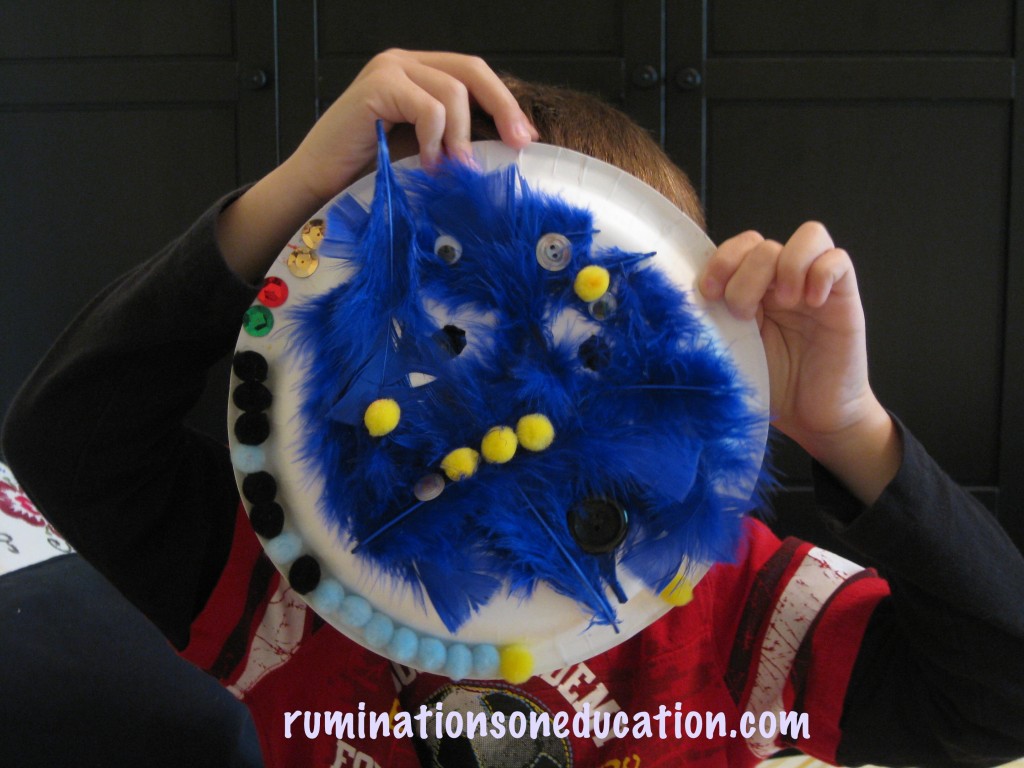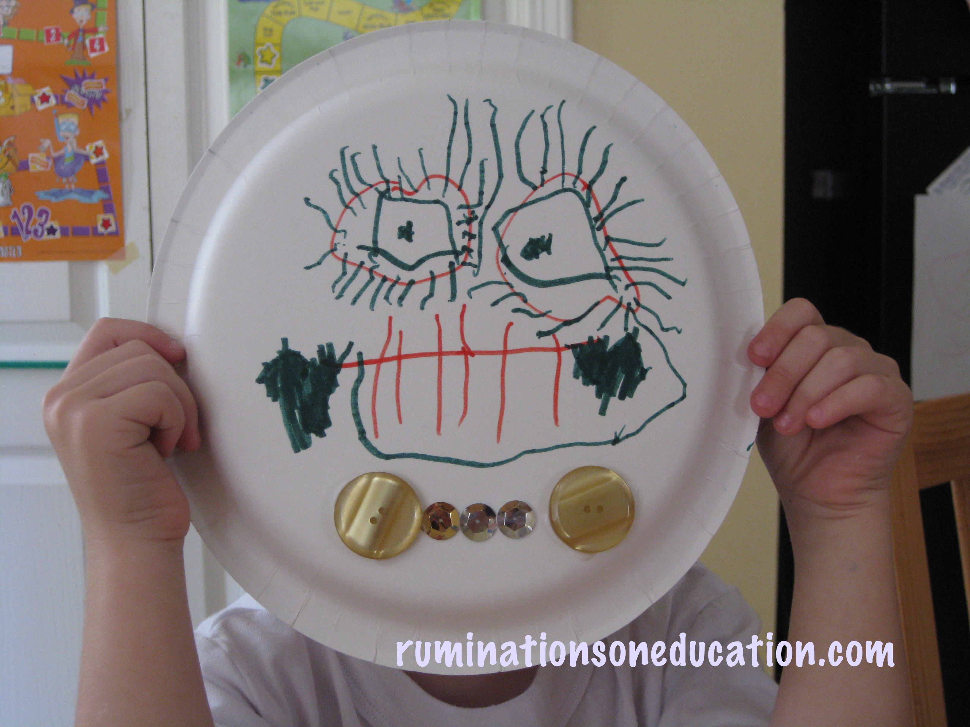 In honor of Halloween, our art project this week was based on Maurice Sendak’s “Where the Wild Things Are.” Instead of going with the project as outlined, I tweaked one of the variations offered at the bottom of the page. We made Wild Thing masks. The boys had a blast. (Storybook Art, page 59)