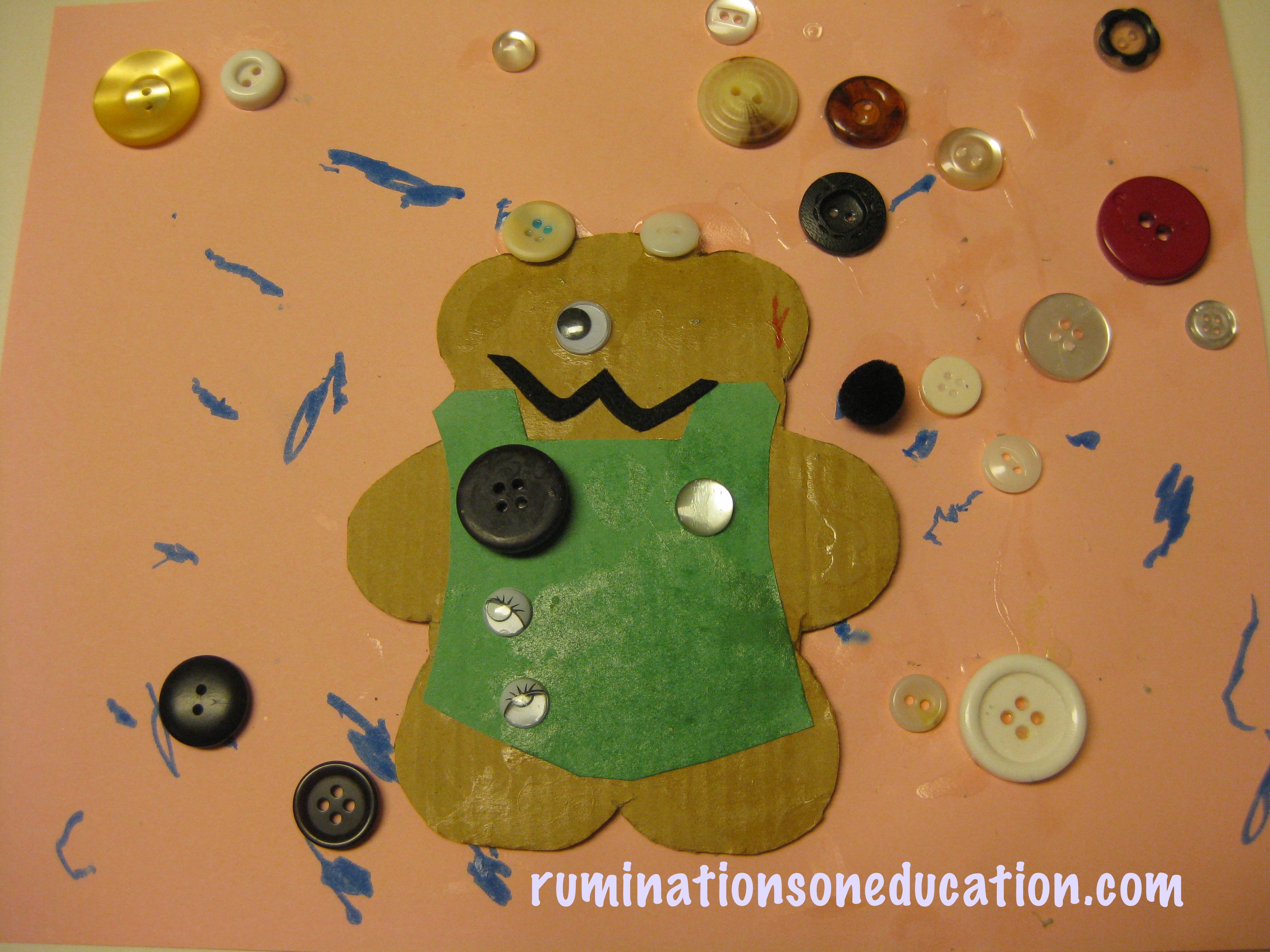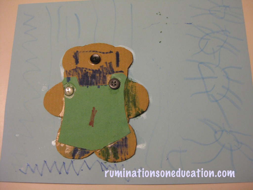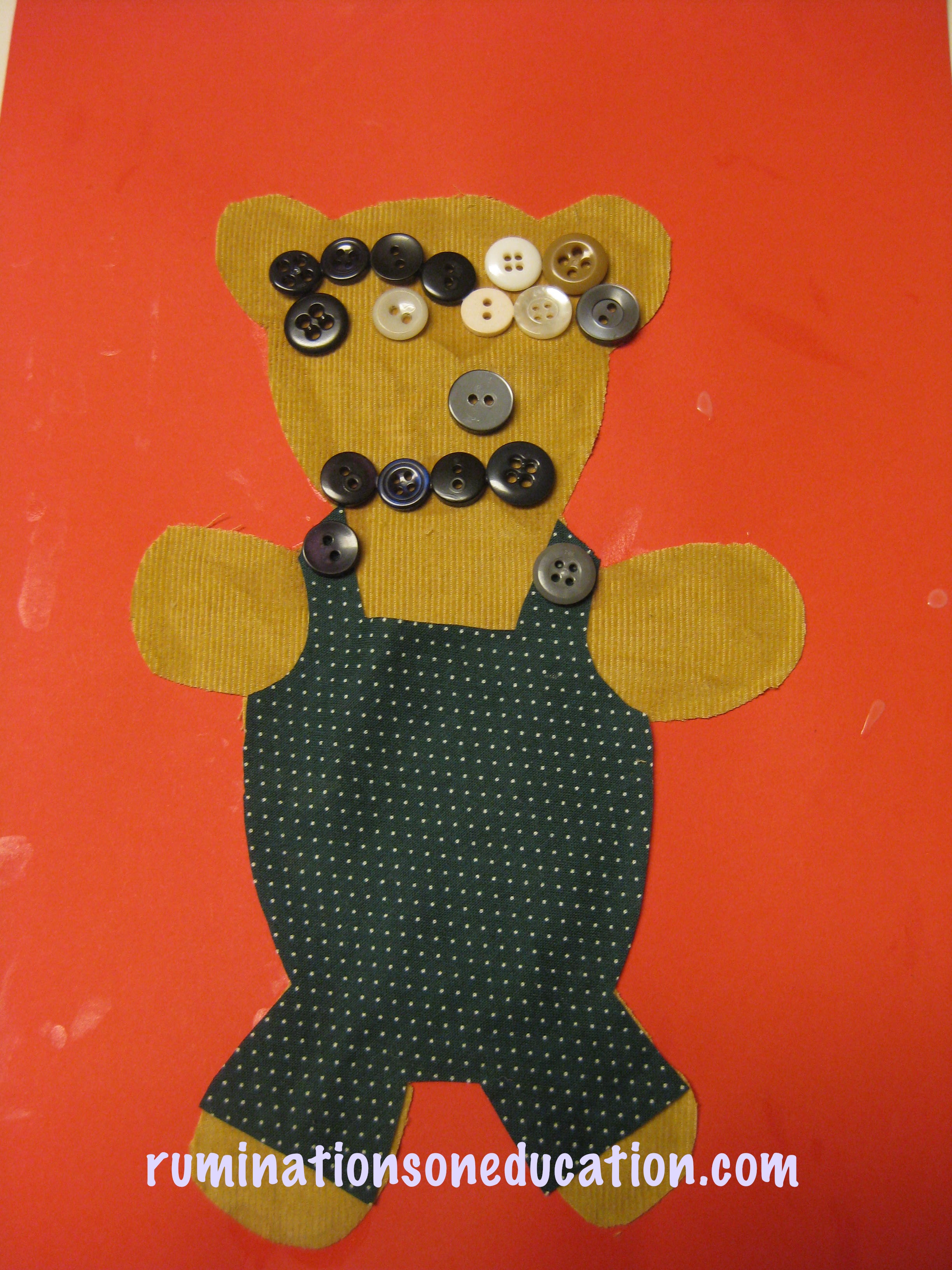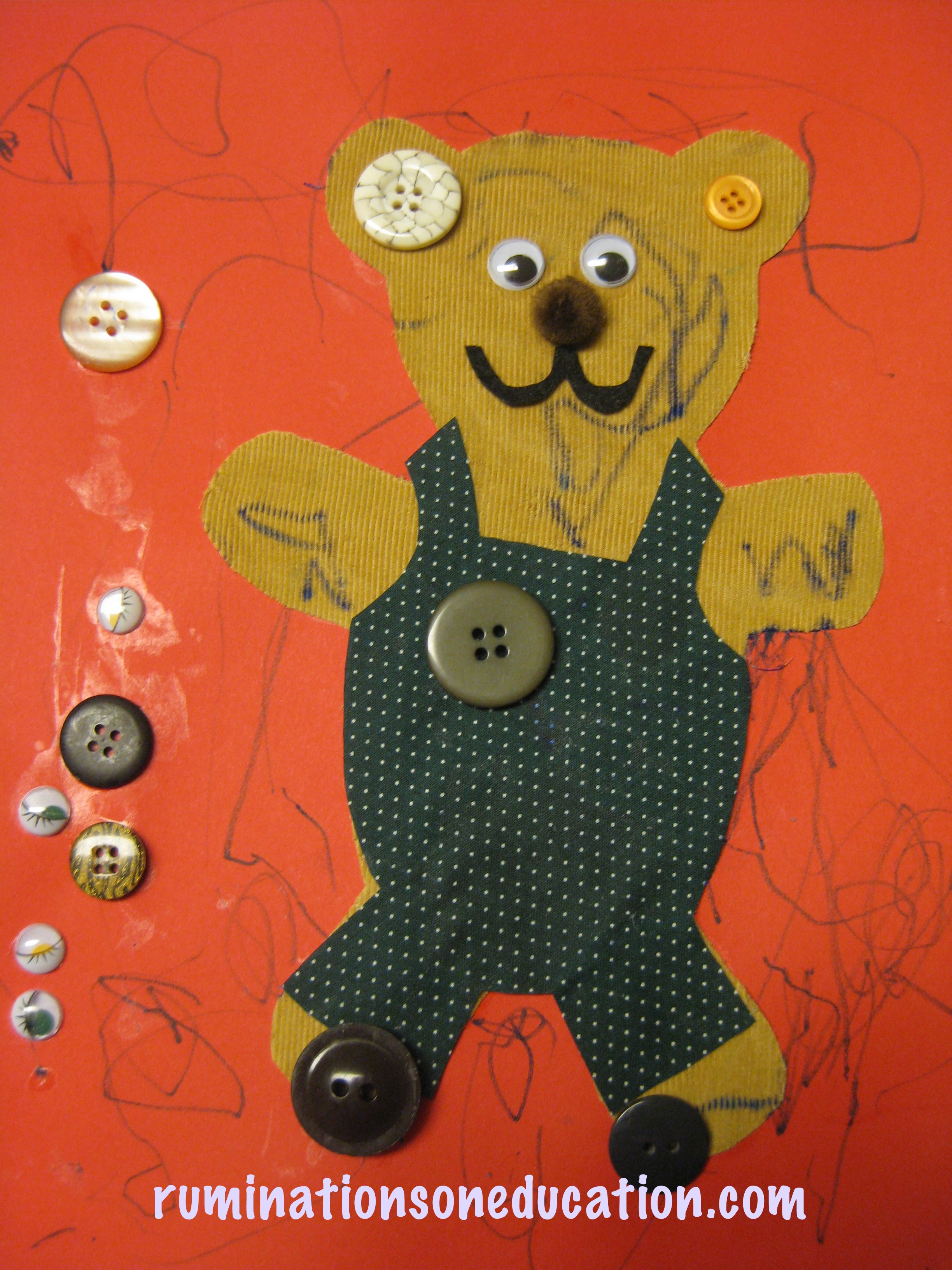 I started by giving them a piece of cardstock (color of their choice, of course) and told them to draw any design they wanted as a background. Then we divvied up the bears I’d created the night before: two cardboard with construction paper overalls and two bears cut from corduroy fabric with fabric overalls. The craft box came out of the cupboard and eyes and buttons found their way onto the papers. They all thought Elmer’s Glue was the greatest. And they were all quite proud of their artistic efforts and all four renderings are on display in our Hall of Fame.
